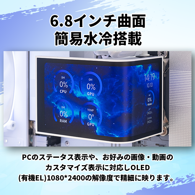 ウォーターブロック部に配された曲面ディスプレイは、内部の美しさを際立たせるとともに、PCのステータス表示や、お好みの画像・動画のカスタマイズ表示に対応しユーザーの個性を表現します。